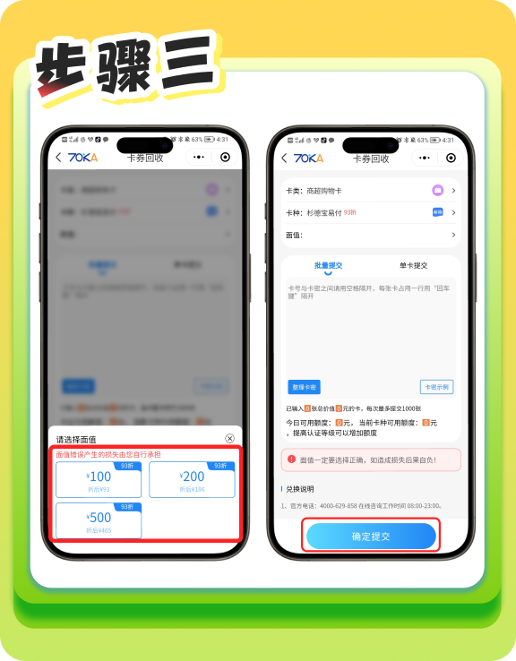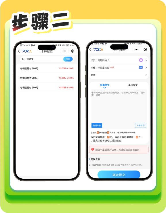 步骤(3):到了跳转后的回收界面,把【杉德宝易付卡】的卡号、密码填好,选好对应的面值,都弄完后点【确定提交】,等着钱到账就行。