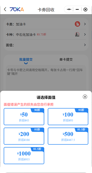 代表平台包括70KA礼品网等,其核心优势在于专业度高、价格有优势,比如中石化加油卡回收能够给到93.5折,流程高效,能快速完成核查与结算。同时,正规的线上中石化加油充值卡回收平台会严格遵守隐私保护规定,不会泄露用户的加油卡信息与个人资料。