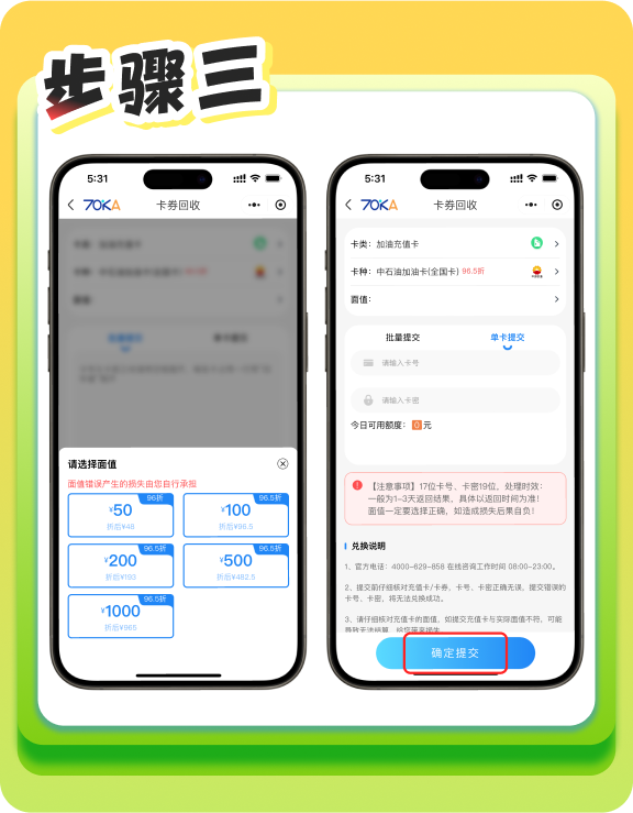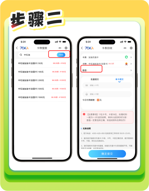 步骤(3):到了跳转后的回收界面,把【中石油加油卡】的卡号、密码填好,选好对应的面值,都弄完后点【确定提交】,等着钱到账就行。