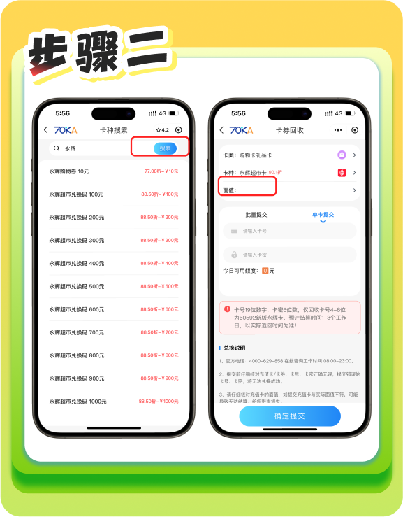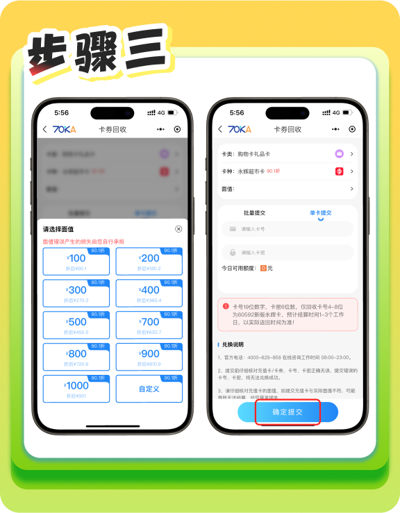 步骤(3):到了跳转后的回收界面,把【沃尔玛购物卡】的卡号、密码填好,选好对应的面值,都弄完后点【确定提交】,等着钱到账就行。