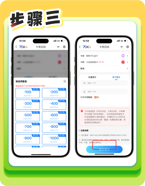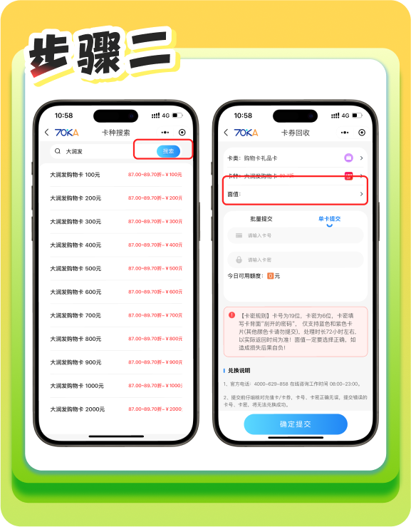 步骤(3):到了跳转后的回收界面,把【大润发购物卡】的卡号、密码填好,选好对应的面值,都弄完后点【确定提交】,等待验证并结算。