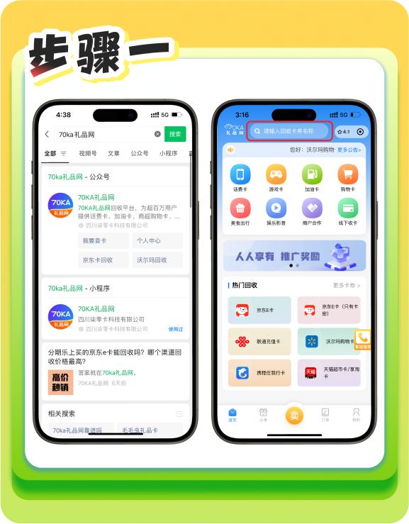 步骤(1):打开微信搜“70KA礼品网”,找到入口后,在回收主页里找到搜索框。