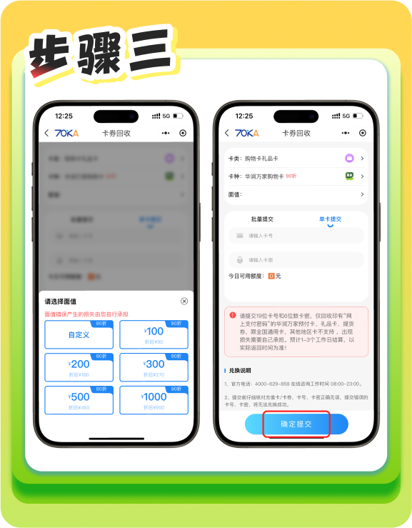 步骤(3):到了跳转后的回收界面,把【华润万家购物卡】的卡号、密码填好,选好对应的面值,都弄完后点【确定提交】,等着钱到账就行。