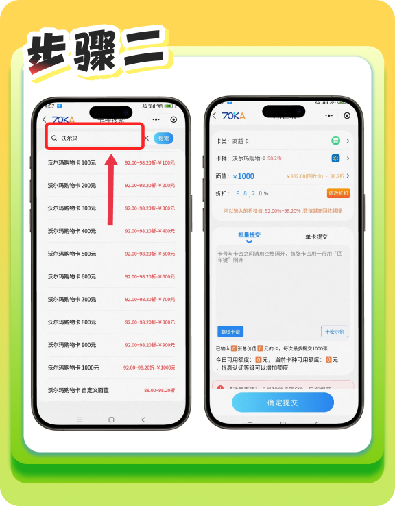 步骤(3):到了跳转后的回收界面,选好【沃尔玛购物卡】对应的面值,再把卡号、密码填好,都弄完后点【确定提交】,就完成回收了。