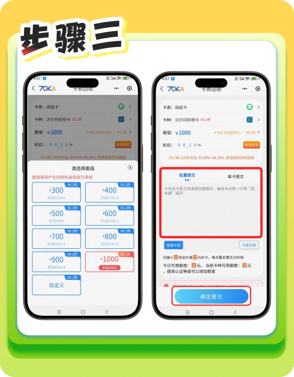 步骤(3):到了跳转后的回收界面,选好沃尔玛购物卡对应的面值,再把卡号、密码填好,都弄完后点【确定提交】,就完成回收了。