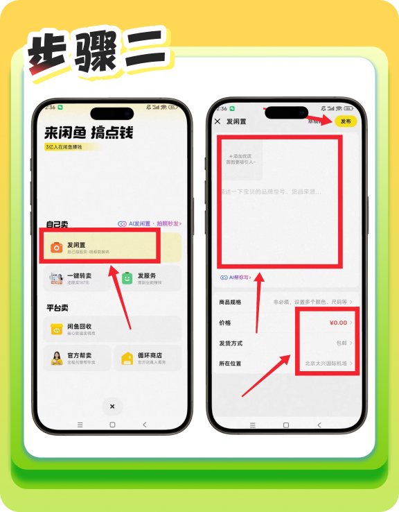 步骤(2):在【发闲置】页面编辑信息并发布(需提前准备好自己的超市购物卡照片),等待买家前来沟通