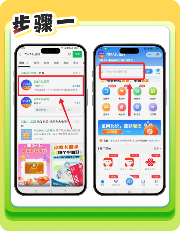 步骤(1):打开微信搜“70KA礼品网”,找到入口后,在小程序的首页里找到搜索框。